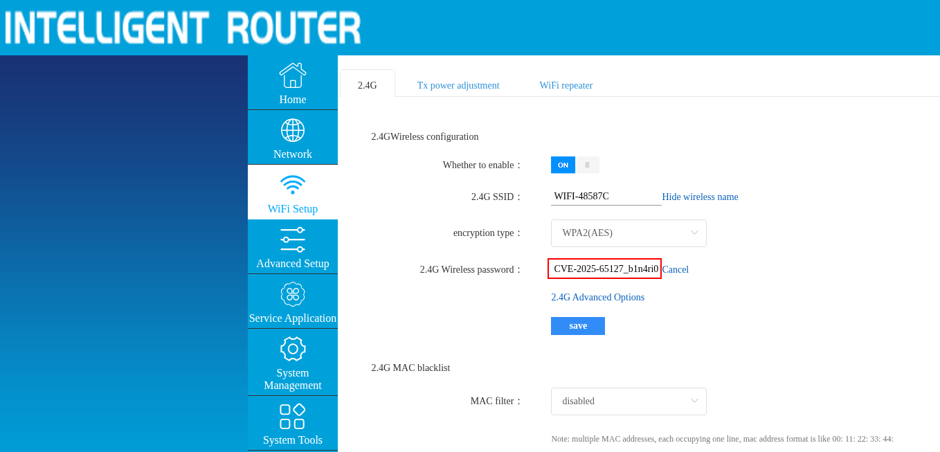 Sensitive information, such as the 2.4G wireless password, set here as CVE-2025-65127_b1n4ri0, is intended to be accessible only to an authenticated administrator via the protected web panel.