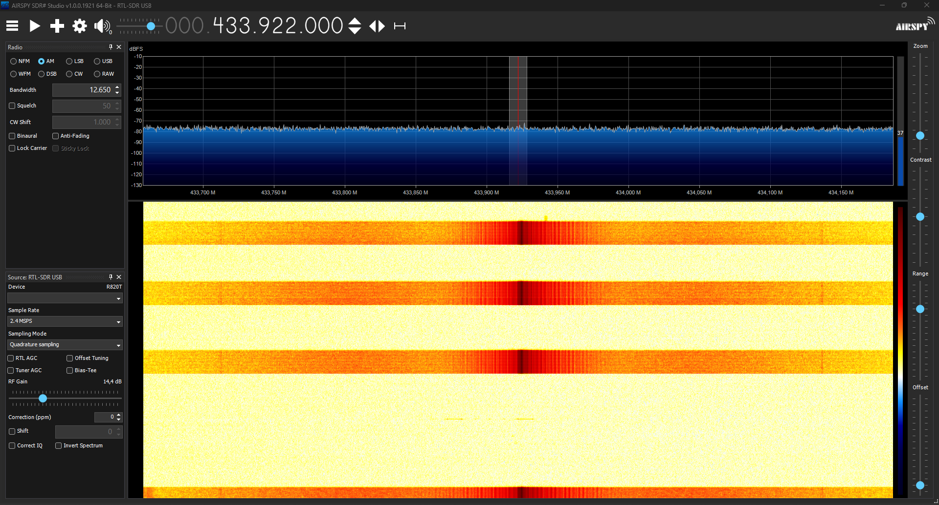 Figure 1: Waterfall view showing the raw RF signal captured at 433.92 MHz during a keyfob button press.