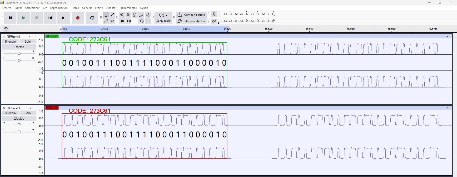 The identity between these captures proves the implementation of a fixed-code protocol. The base station accepts any frame matching the stored UID and command bits, regardless of when it was recorded or how many times it has been used.